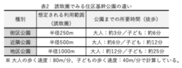 住区基幹公園は、さらに街区公園・近隣公園・地区公園の3種類に分類されます。この3種類の違いの一つに、想定される利用範囲(誘致圏)があります。表2で示すように、誘致圏が異なるということは、その公園へ通うのに掛かる時間が異なるということです。なかでも、大人も子どもも気軽に歩いていける距離にある、最も住まいに身近な公園が「街区公園」です。