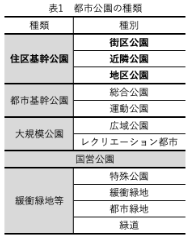 都市公園は、表1 のように5 種類に分類され、種類ごとにさらに細かく種別されます。今回